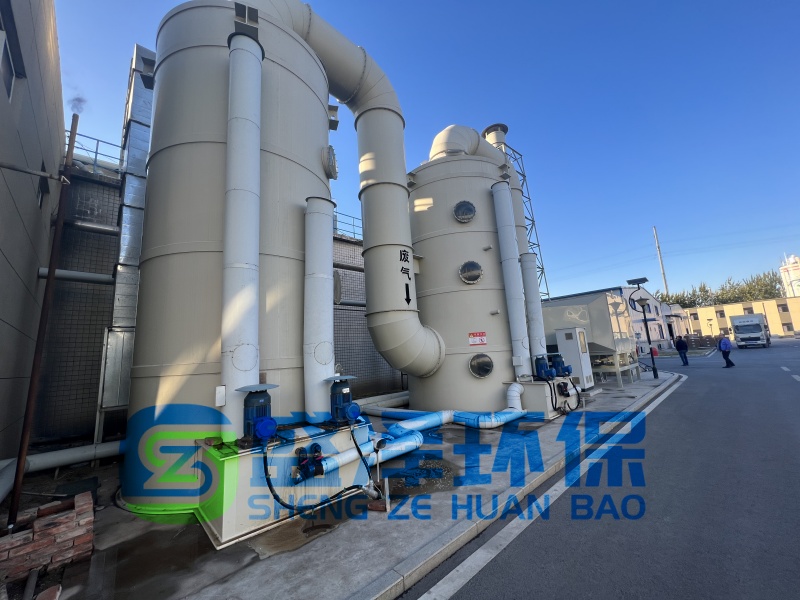 廢氣進(jìn)入第一級(jí)噴淋塔,與向下噴灑的化學(xué)吸收液(如稀硫酸、次氯酸鈉或?qū)S贸魟┠媪鹘佑|。