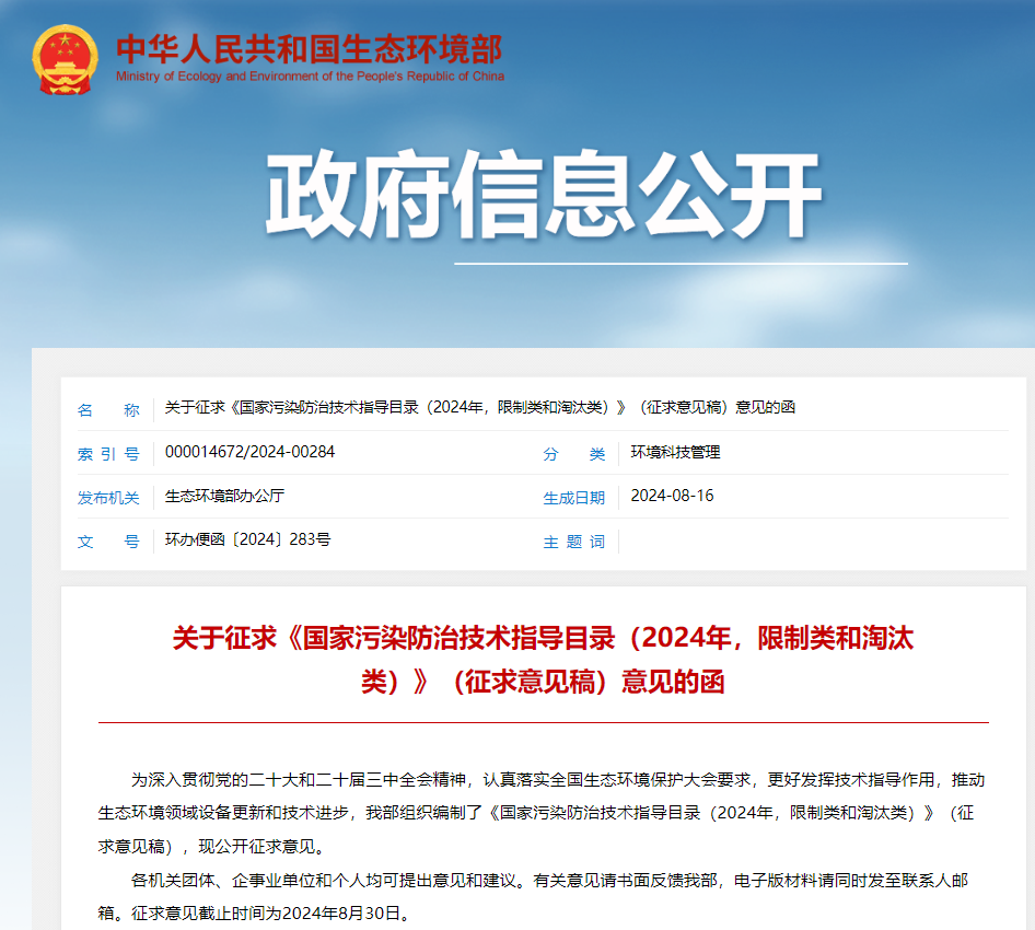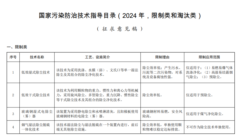 關(guān)于征求《國家污染防治技術(shù)指導(dǎo)目錄(2024年,限制類和淘汰類)》(征求意見稿)意見的函