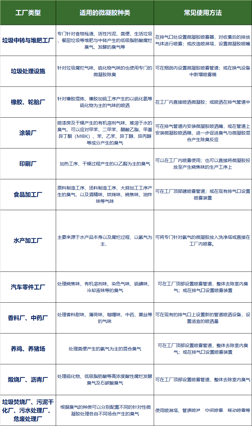 以上是微凝膠較為常見的使用方法,而微凝膠因種類眾多,如果根據(jù)臭氣成分進行針對性除臭,效果就更加理想。各行各業(yè)的臭氣源不同,臭氣成分不同,需要使用不同類型的微凝膠,以下為例子為不同工廠的微凝膠種類及常見使用方法。
