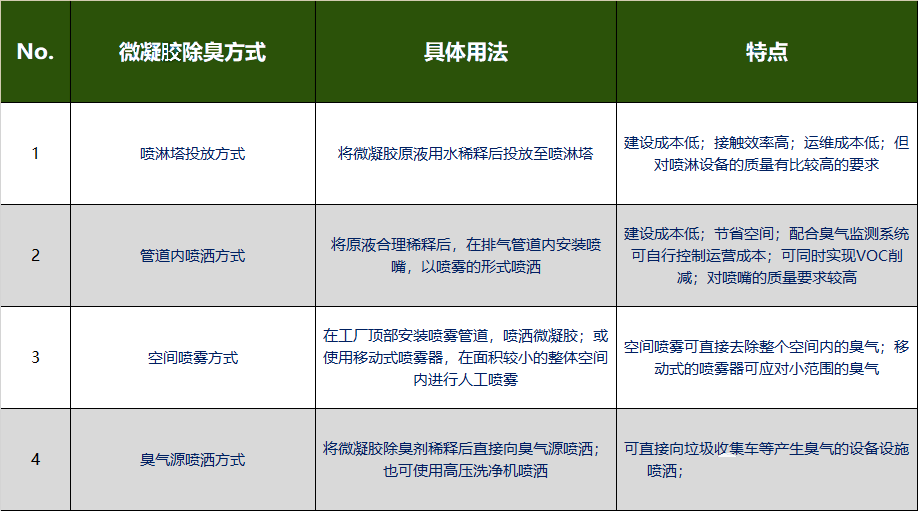 表2 微凝膠除臭劑在各類工廠內(nèi)主要的使用方法